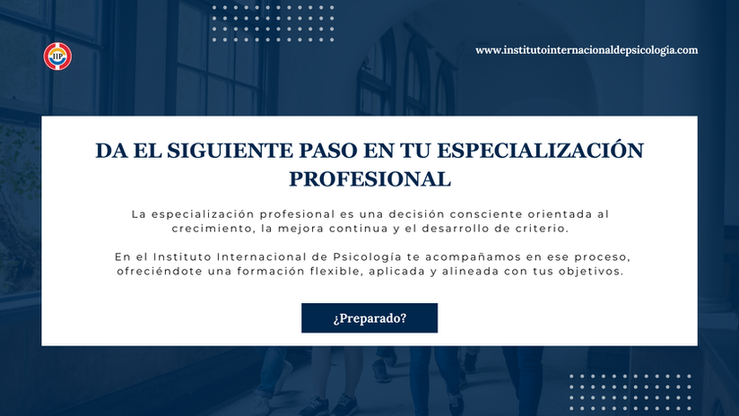 El Instituto Internacional de Psicología ofrece una formación rigurosa y actualizada, orientada a la especialización profesional y a la aplicación real del conocimiento psicológico. Sus programas están diseñados para proporcionar una comprensión sólida de los procesos psicológicos, integrando teoría y práctica desde una perspectiva clara, estructurada y orientada al ejercicio profesional.